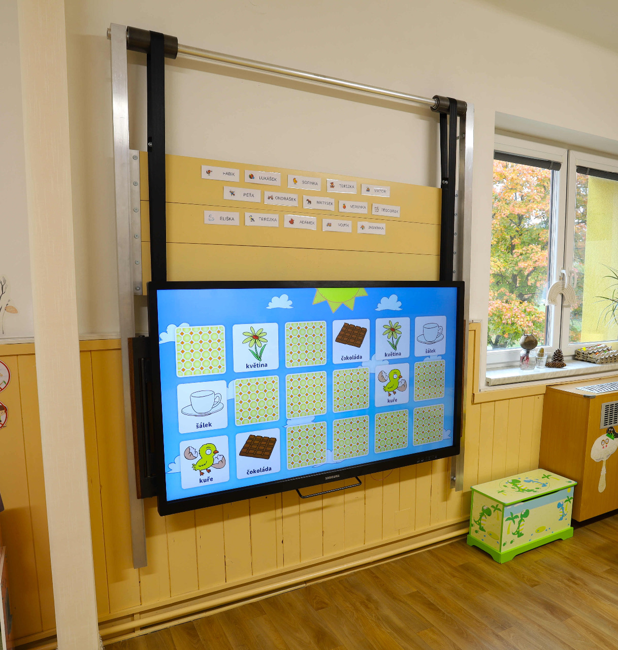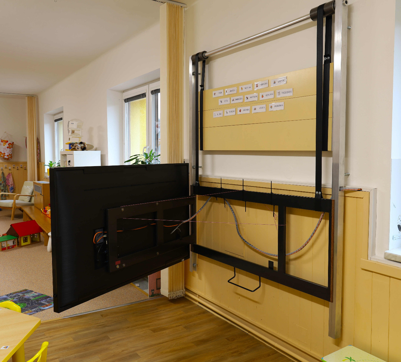 Děti v naší školce mají nově možnost využívat interaktivní tabuli o úhlopříčce 65", která výrazně obohacuje jejich každodenní program. Pro tabuli jsme nechali vyrobit unikátní posuvný a výklopný držák, díky němuž ji lze snadno výškově nastavit pro všechny věkové skupiny. Boční vyklápění navíc umožňuje využití tabule i při cvičení a dalších aktivitách v druhé části učebny.